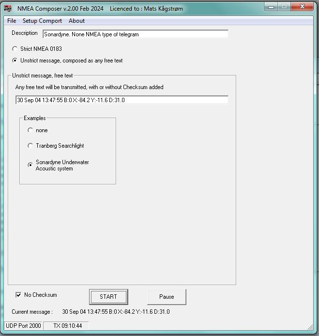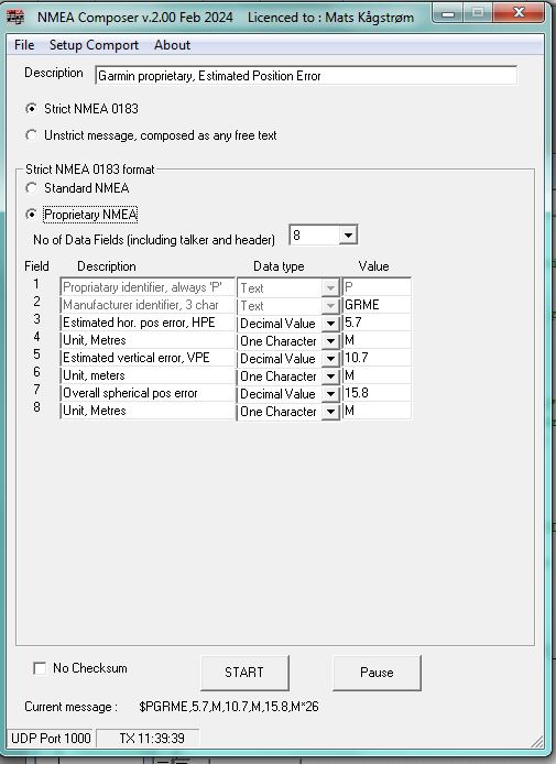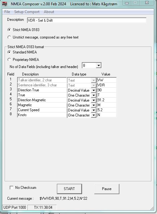 NMEA Composer is designed for user composition and simulation of any NMEA telegram. The telegram can be transmitted on UDP or serial port and values manually changed.