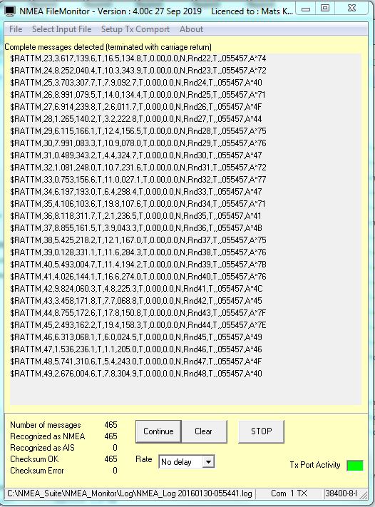 NMEA Monitor is designed to monitor NMEA or AIS data received on serial device, UDP or TCP/IP. A special version of the program, NMEA Filemonitor, monitors data from file. NMEA_Filemonitor can also transmit the NMEA messages on a serial port, UDP or TCP/IP..